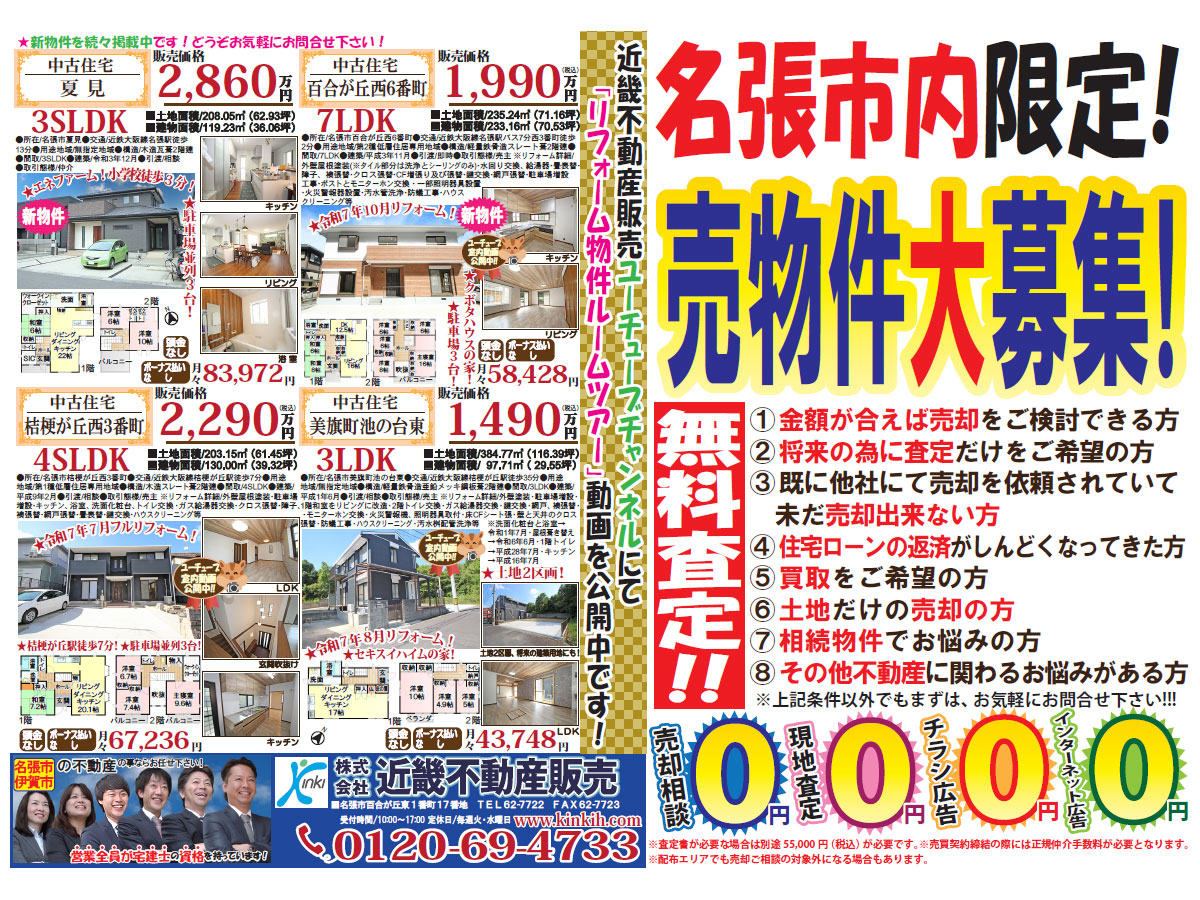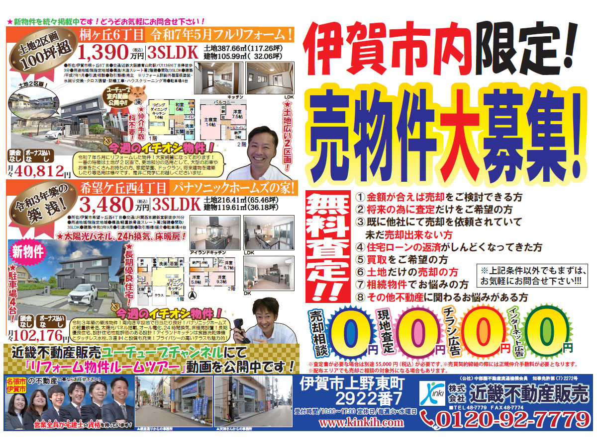 弊社は三重県名張市・伊賀市のみを主要エリアとして30年以上不動産業を営んでおり、また居住用建物や宅地に絞った不動産売買専門の会社です。弊社営業メンバーの全員が、国家資格である「宅地建物取引士」の資格を持っており、不動産売買に係わる知識を備えておりますので、メリットだけではなく、特にデメリットをきっちりお伝えすることで、ご判断して頂けるように日々心掛けております。売主様には、弊社独自の販売活動で早期売却を目指せる販売促進ツールが多数ございます。